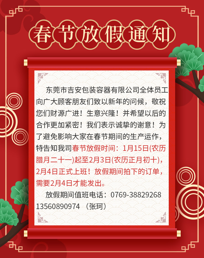 新春復(fù)始,萬象更新!非常感謝各位新老客戶長期以來對吉安容器的鼎力支持與關(guān)照,在新春來臨之際,東莞市吉安包裝容器有限公司全體員工向廣大顧客朋友們致以新年的問候,敬祝您們財(cái)源廣進(jìn)!生意興?。〔⑾M院蟮暮献鞲泳o密!我們表示誠摯的謝意!