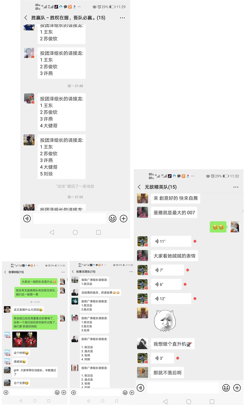 部門主管敲定活動細節(jié)、安排,通過盲選的方式,分配好四組成員,當晚建立活動微信群,推選各組組長,并展開如火如荼的線上討論,大家集體出謀劃策,尋找素材,分配任務、尋找制作視頻,迅速敲定主題,并敲定集體制作時間。