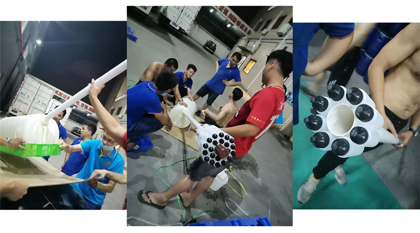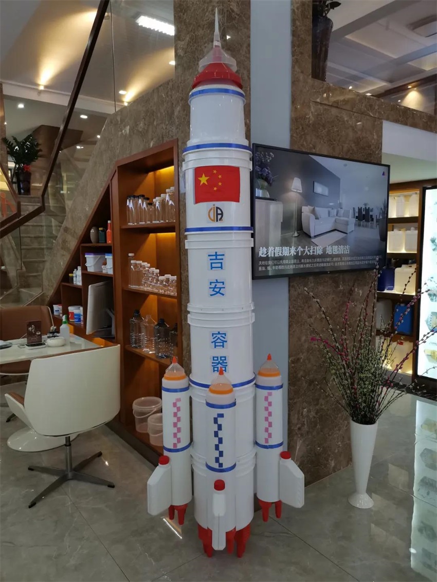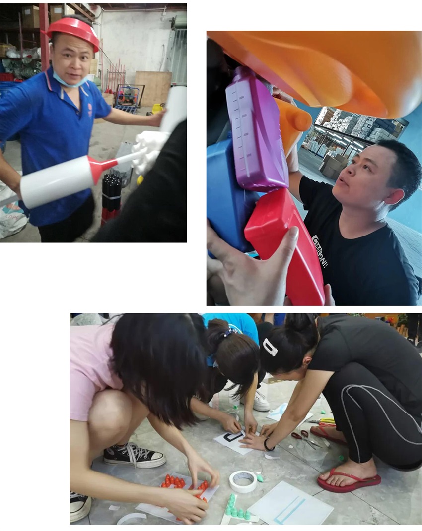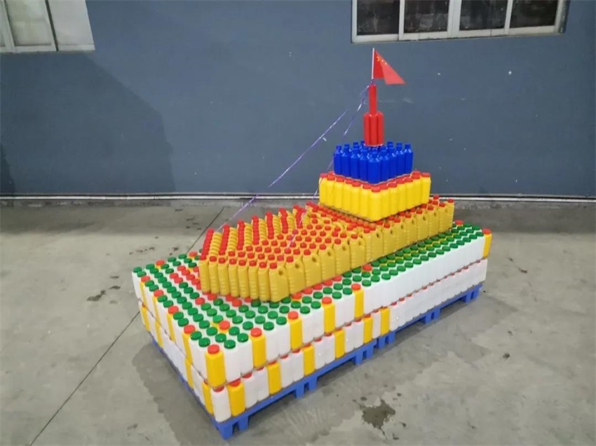 該隊模型作品”一波三折”,前期討論了多種方案,最終借鑒超市堆碼花式陳列的方式,確定做輪船,用方瓶,圓瓶、機油瓶系列進行輪船的設計,該作品象征吉安容器未來將繼續(xù)乘風破浪,披荊斬棘,勇往直前,揚帆遠航。