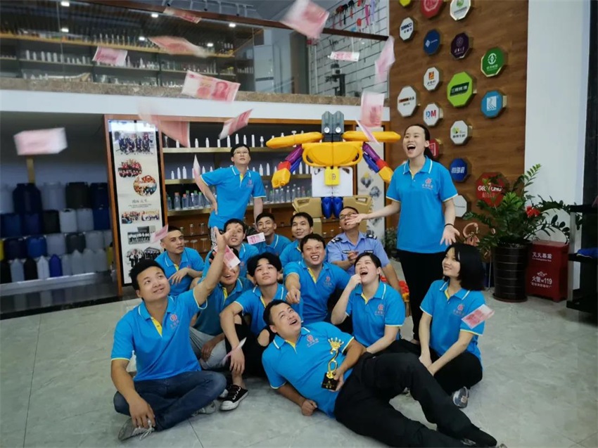 在試用了鐵罐、灰色機油瓶、膠水瓶等產(chǎn)品均不理想之后,最終敲定采用純色風格產(chǎn)品元素搭配藍色邊框設計,發(fā)射中的火箭寓意我們團隊業(yè)績一飛沖天,直沖云霄!