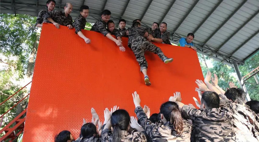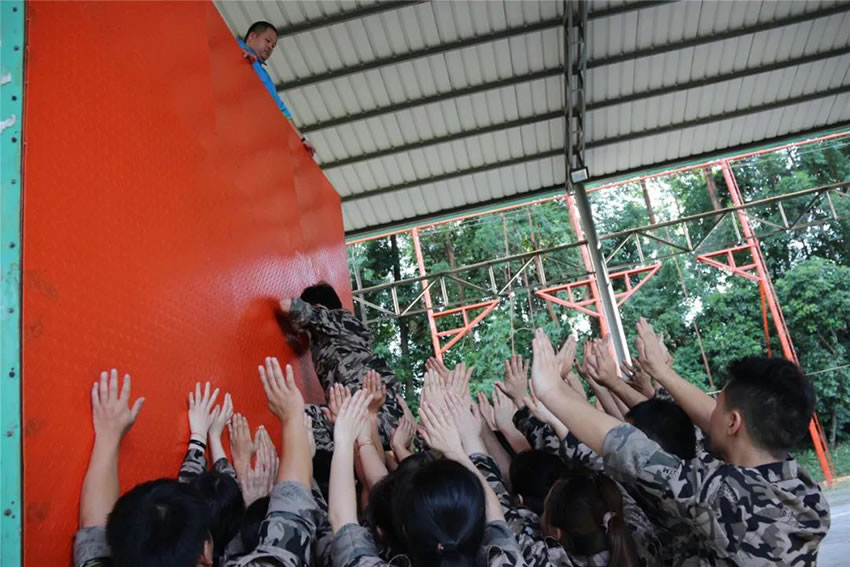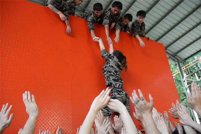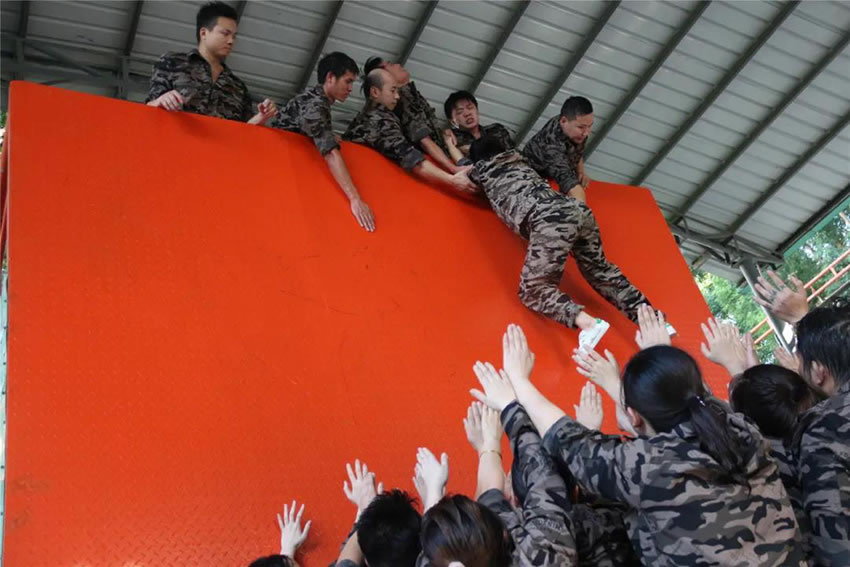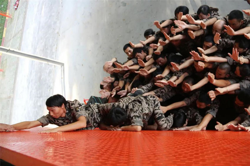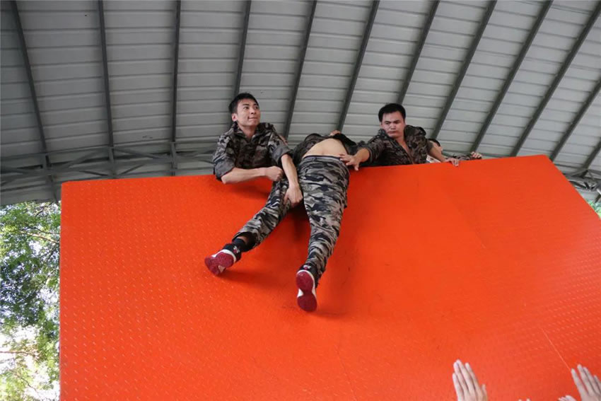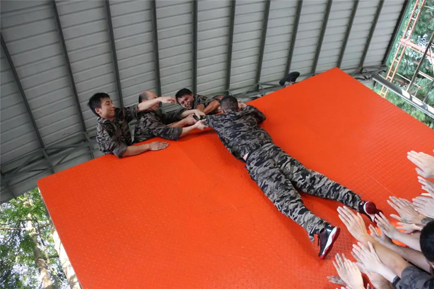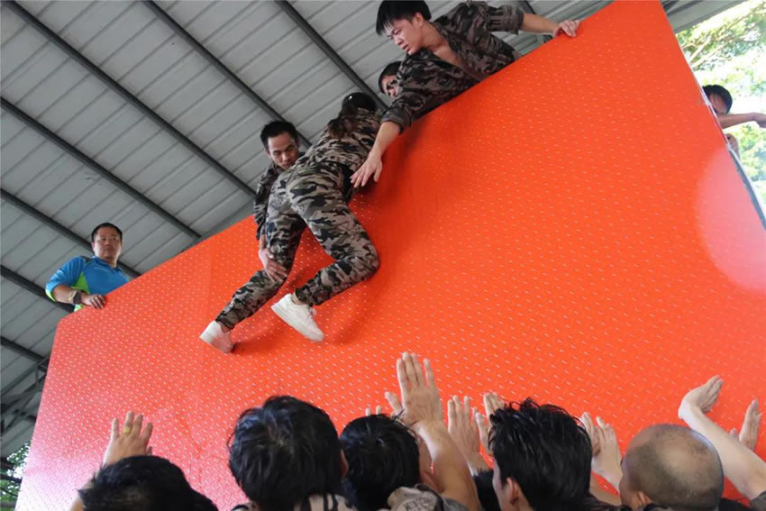 所有參與者在不借助任何工具和外力的情況下,相互協(xié)作,堆成人墻,每人徒手翻越過一堵 4.2 米高的墻。所有過程都只需要通過人力,不能自主蹬墻爬墻,不管環(huán)節(jié)中哪一個人犯規(guī)哪怕是最后一位,也需要整個團(tuán)隊重新再來。