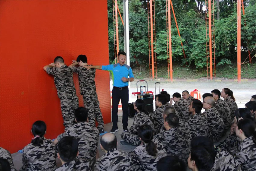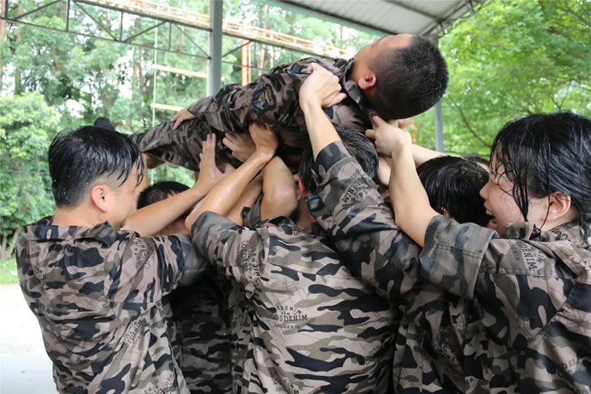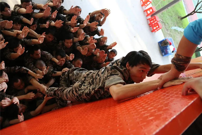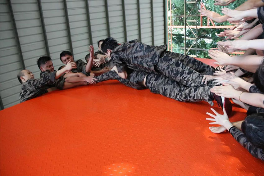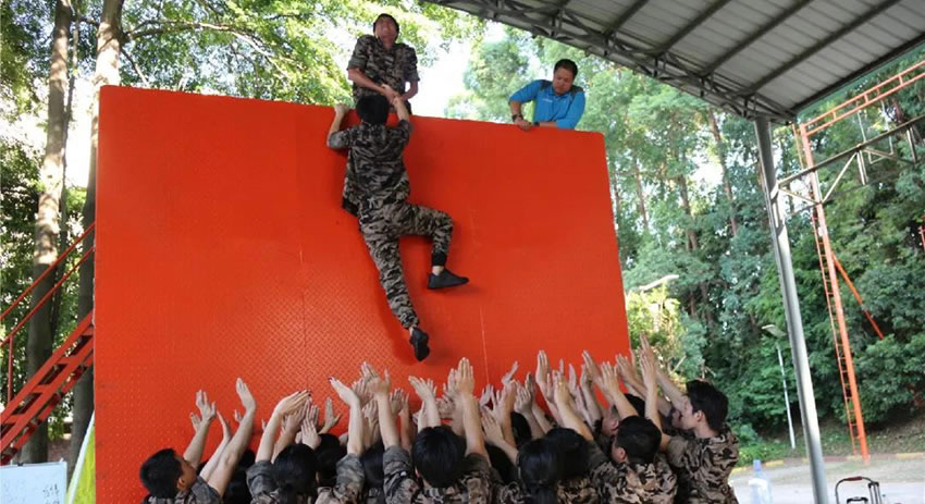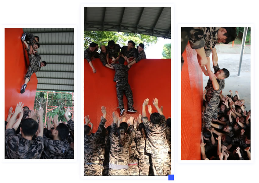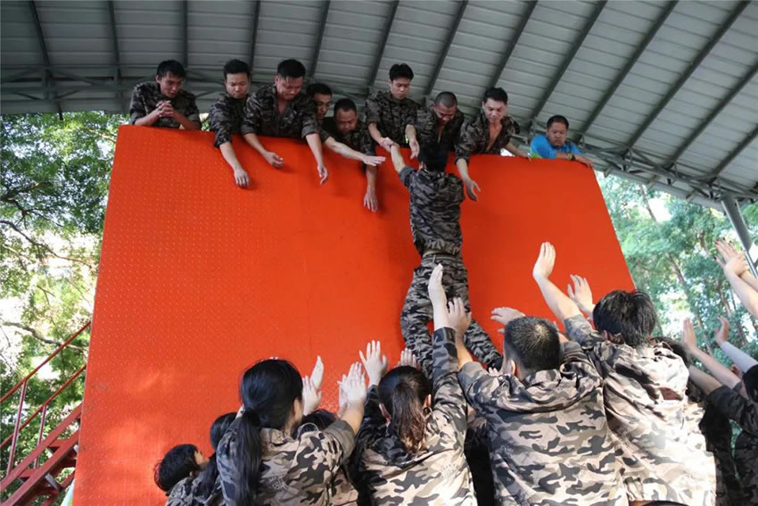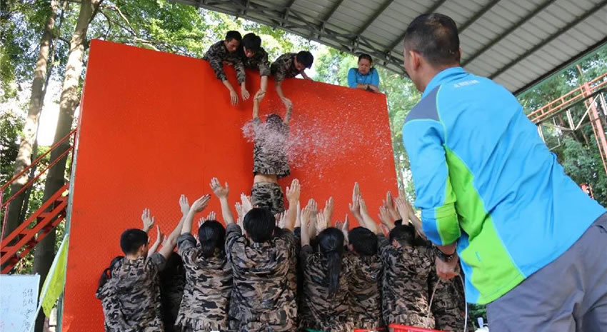 所有參與者在不借助任何工具和外力的情況下,相互協(xié)作,堆成人墻,每人徒手翻越過一堵 4.2 米高的墻。所有過程都只需要通過人力,不能自主蹬墻爬墻,不管環(huán)節(jié)中哪一個人犯規(guī)哪怕是最后一位,也需要整個團(tuán)隊重新再來。