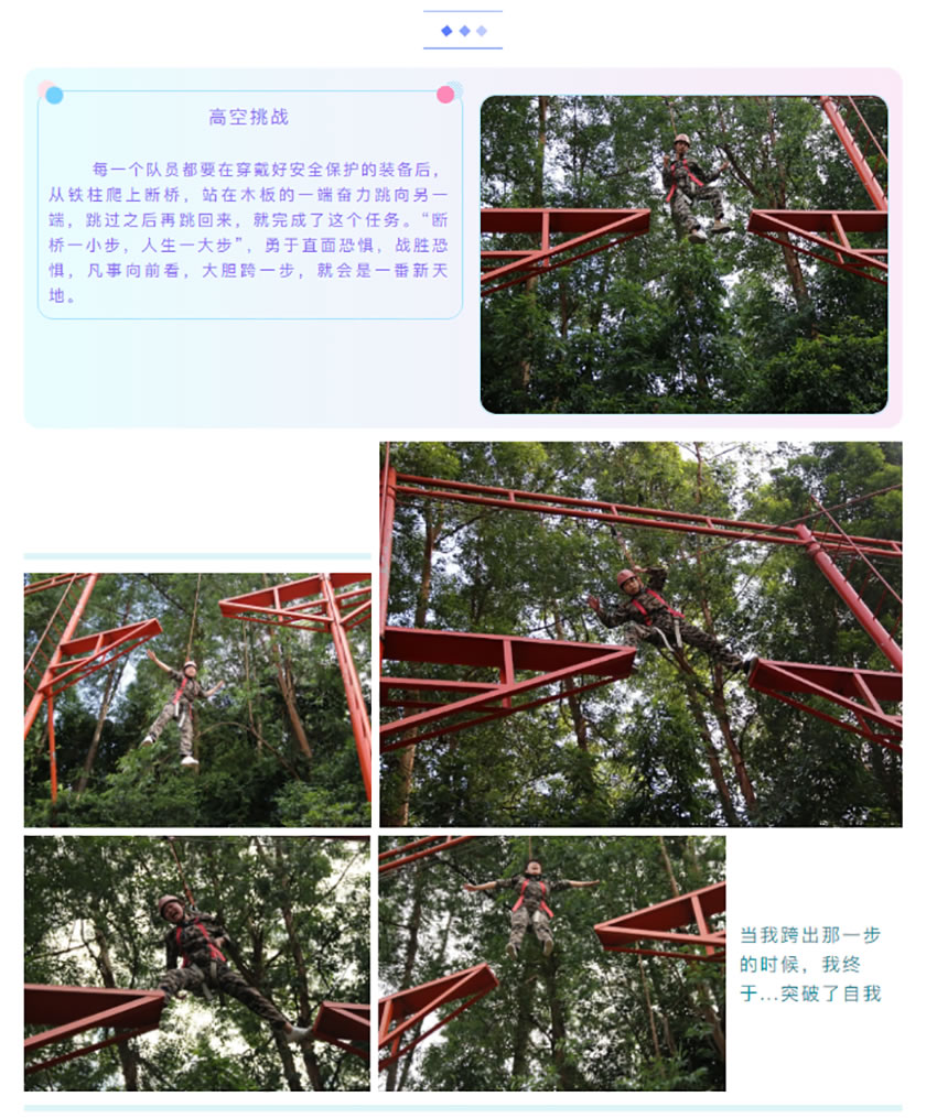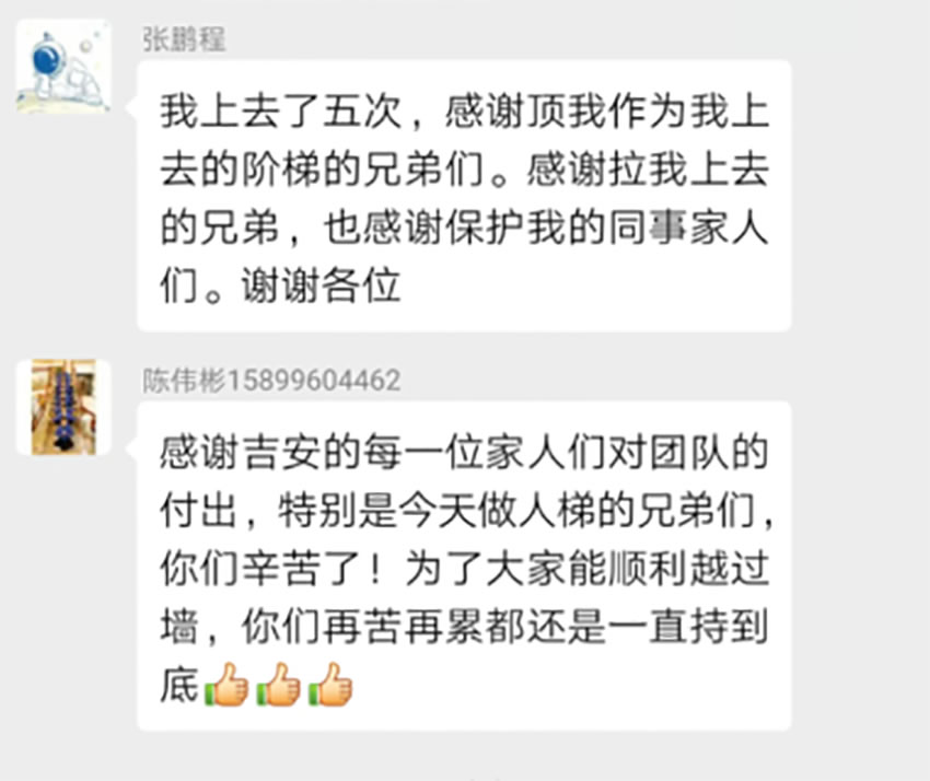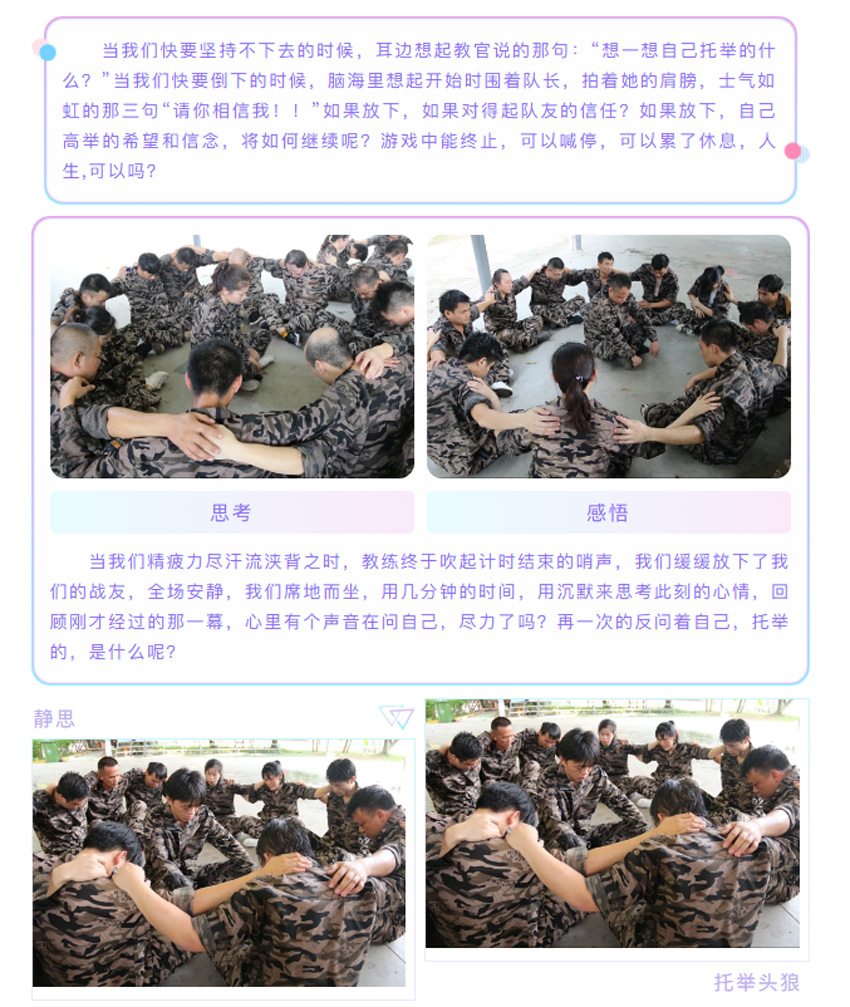 大家用肩膀、大腿、手臂,血肉之軀,組成了一面梯子,一個個踩著他們,翻過那面墻, 我們用無聲的語言,一個個把同事送上墻的另一面,當(dāng)?shù)谝淮文_踩在人身上的時候,原來,痛的不僅僅是被踩的那個人,當(dāng)腳踩在別人身上不敢用力,而不用力根本上不去的時候,心中有一塊地方,隱隱作痛,當(dāng)上面的人用堅定的眼神向你伸出了雙手,用他最大的力量把你拉上來時,在沒有任何保護(hù)只有人墻的情況下,內(nèi)心想的不是恐懼,而是放心,我放心我的伙伴不會 讓我掉下來,我放心我上面的伙伴會把我拉上來,我感謝那些拉我、推我、扶我鼓勵我的每個人。我看到了那個從頭到尾踩了不下上百次的人墻,他從頭到尾沒有叫過一聲的累,哪怕是教練說,累了,可以換人,可是,他們,從開始到結(jié)束,默默的承受這一切,你退下了,總有人要頂上,痛苦不會因為放棄而結(jié)束,而總會有人,負(fù)重前行。