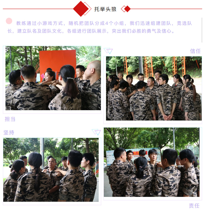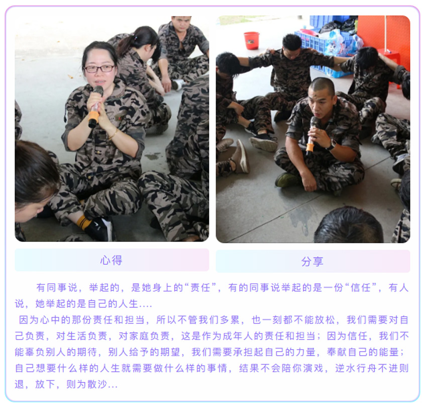通過重復(fù)站軍姿、喊口令的方式,訓(xùn)練我們的自律能力,在教官嚴(yán)格的命令下,我們必須像軍人一樣的站直,紋絲不動,我們要根據(jù)教官的要求完成任務(wù),并不是要求我們的動作要和軍人一樣標(biāo)準(zhǔn),最重要的一點是要學(xué)會軍人的態(tài)度,態(tài)度及心態(tài)決定一切,你是以什么樣的心態(tài)來對待一件事情,就會帶來什么樣的結(jié)果。在最后的執(zhí)行教官在30秒鐘之內(nèi)找到6個人擁抱大聲說出“你是我最棒的朋友”這一環(huán)節(jié)中,對我觸動頗深,當(dāng)我聽到命令后馬上展開了行動并且迅速提前完成了任務(wù),感到沾沾自喜??森h(huán)節(jié)結(jié)束后教官問我們,你能做得更好嗎?你的時間和能力就只能完成6個了嗎?我想,是啊,我明明可以做得更好,我還有時間,為什么我會在完成指標(biāo)后停???是自己理解錯了教官的意思還是我只想完成相對應(yīng)的任務(wù),僅此而已呢?我想,兩者都有,我在工作中是否能夠“創(chuàng)造更高價值?奉獻(xiàn)更大力量?”我是否可以發(fā)揮更大空間?我是否做到公司文化中的其中多一點:做任何工作,盡可能比公司和上司要求的多一些,超越他們的期望。。。在這個環(huán)節(jié),我們首先學(xué)會的是,做人的心態(tài);對待工作的態(tài)度。