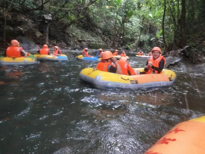 接下來等著我們的是大家期待已久的項目---漂流。古龍峽國際漂流賽道,全長6.1公里,高低落差378米,最高時速可達72km。在驚魂未定之際又戛然而止,好怕怕!