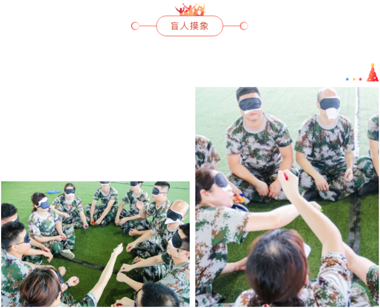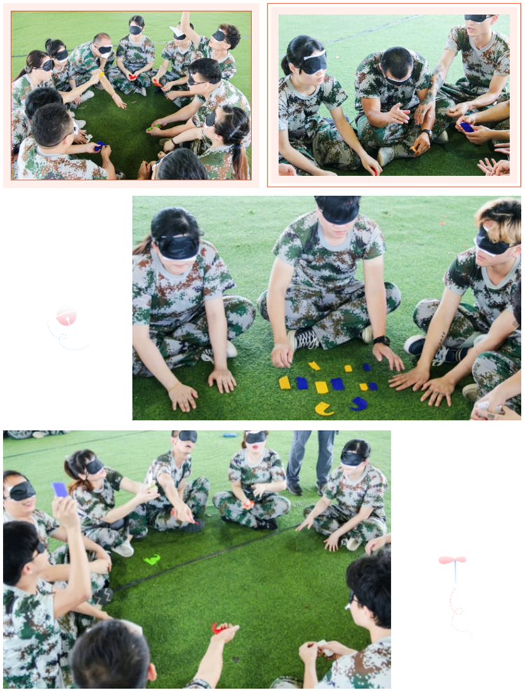 四組成員各自蒙住眼睛,每組團隊都會拿到34張6種顏色和6種形狀的卡片,其會有2種顏色各自缺少一個形狀的色板,每名成員將從教練手中領到2—3塊色板,團隊成員只能詢問教練拿到的版的顏色,團隊成員需要通過有效的溝通,合作,分析來判斷缺少的是那種顏色,哪個形狀算完成團隊任務,以計時的方式得出勝負。