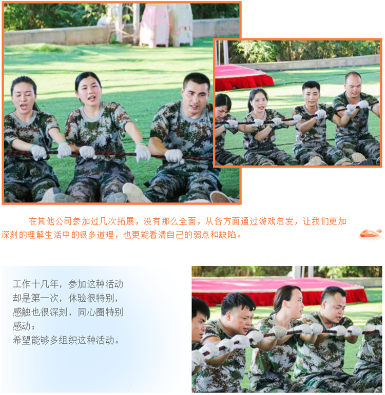 本次“同心同行,融合共贏”的拓展活動在“同心圈”中活動圓滿的落幕,很多人都在思考拓展的意義在哪,也有很多人認為這是一種精神的洗腦,也有一些人認為通過一天半天的雞血,在熱情褪去之后,并不能帶來實際的結果,而我想說的是,正如文章開頭所講:“成年人不太容易被道理說打動,他們習慣用自己的經驗和認知判斷問題”,所以這是一個見仁見智的問題,而我在參加的這連續(xù)三屆的拓展活動以來,我所感受到的對比,我覺得,它是可以幫助我們得到一些成長的,我們不要求一場拓展下來,能夠得到多少升華,可能對于很多人來說,其中有某句話,某個場景能讓自己感同身受,就足夠了,并不需要所有的東西集體得到共鳴,投入、參與其中,你總會找到樂趣和成長。