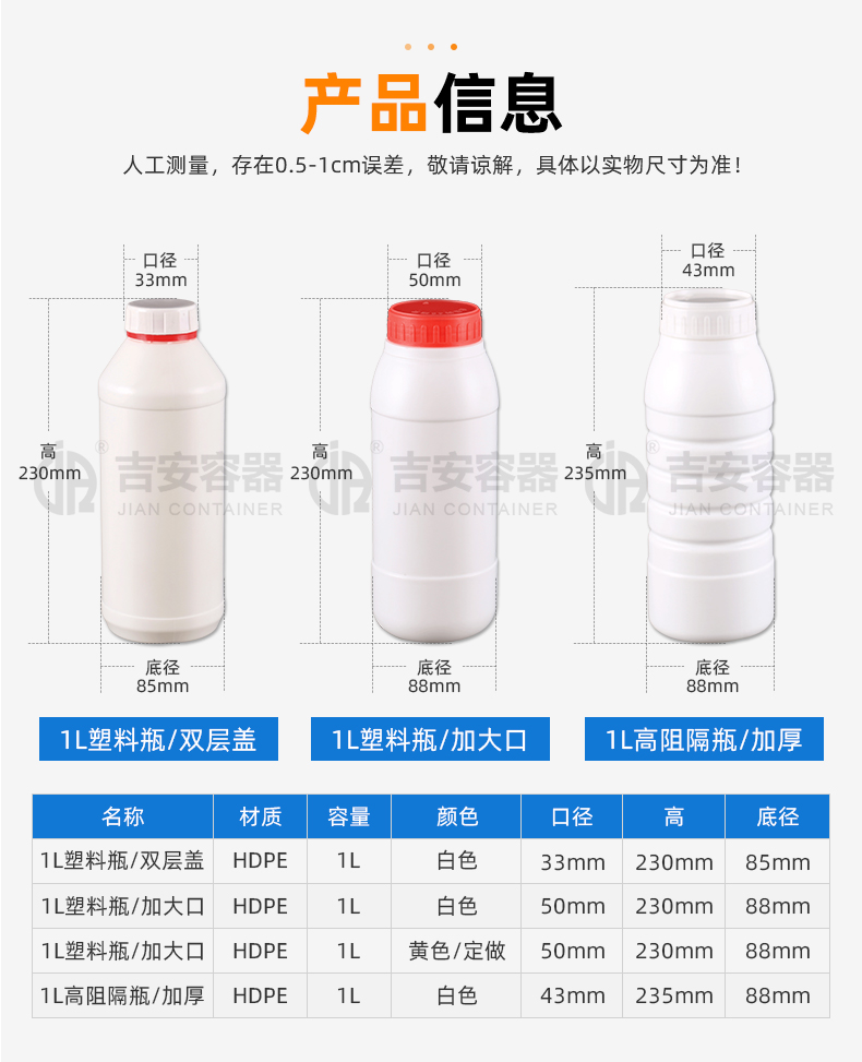 東莞市吉安包裝容器有限公司創(chuàng)立于2000年8月1日,是中國(guó)知名品牌企業(yè)。已通過(guò)ISO 9001質(zhì)量管理體系資質(zhì)認(rèn)證,加入了中國(guó)中空協(xié)會(huì),并獲得《中國(guó)知名品牌》,《國(guó)家標(biāo)準(zhǔn)合格產(chǎn)品》,《全國(guó)重合同守信用AAA級(jí)企業(yè)》,《質(zhì)量.服務(wù).誠(chéng)信AAA企業(yè)》等榮譽(yù)稱號(hào)。根據(jù)材質(zhì)的不同,我們的產(chǎn)品分為塑料容器、鐵質(zhì)容器、鋁材容器、玻璃容器、紙質(zhì)容器等五大類。按產(chǎn)品的名稱分為塑料桶、塑料瓶、包裝桶、涂料桶、機(jī)油桶、油脂桶、化工罐、膠水瓶、鐵桶、鐵罐、鋁瓶、鋁罐、阻隔瓶、高阻隔瓶等,容量從3ML至1000L多種規(guī)格,多種款式。適合包裝的產(chǎn)品包括:化學(xué)試劑、化工原料、化工助劑、飼料添加劑、油墨、油漆、樹脂農(nóng)藥、日用化學(xué)品、聚氨脂、膠粘劑,廣泛應(yīng)用于化工、建筑、食品、醫(yī)療、生物等各領(lǐng)域。
