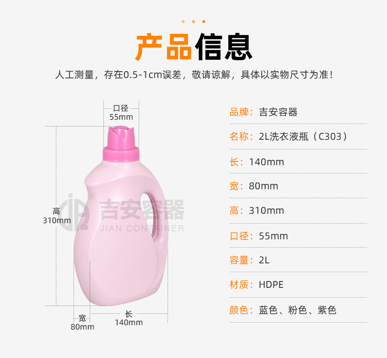 東莞市吉安包裝容器有限公司創(chuàng)立于2000年8月1日,是中國知名品牌企業(yè)。已通過ISO 9001質(zhì)量管理體系資質(zhì)認證,加入了中國中空協(xié)會,并獲得《中國知名品牌》,《國家標準合格產(chǎn)品》,《全國重合同守信用AAA級企業(yè)》,《質(zhì)量.服務(wù).誠信AAA企業(yè)》等榮譽稱號。根據(jù)材質(zhì)的不同,我們的產(chǎn)品分為塑料容器、鐵質(zhì)容器、鋁材容器、玻璃容器、紙質(zhì)容器等五大類。按產(chǎn)品的名稱分為塑料桶、塑料瓶、包裝桶、涂料桶、機油桶、油脂桶、化工罐、膠水瓶、鐵桶、鐵罐、鋁瓶、鋁罐、阻隔瓶、高阻隔瓶等,容量從3ML至1000L多種規(guī)格,多種款式。適合包裝的產(chǎn)品包括:化學試劑、化工原料、化工助劑、飼料添加劑、油墨、油漆、樹脂農(nóng)藥、日用化學品、聚氨脂、膠粘劑,廣泛應(yīng)用于化工、建筑、食品、醫(yī)療、生物等各領(lǐng)域。