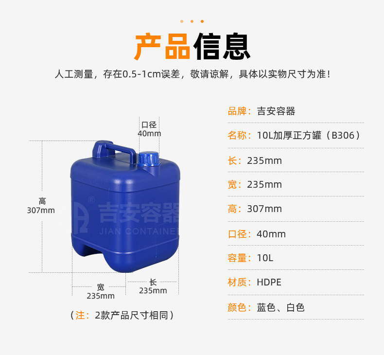 小口塑料桶:采用全新聚乙烯原料吹塑工藝制作而成,具有耐腐蝕,耐酸堿特性,小口設計密封性能強,廣泛應用于化工、清潔、食品、添加劑、汽車等各行業(yè)液體包裝 。