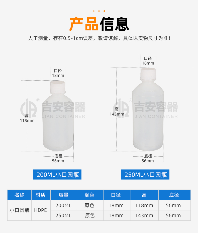 小口塑料瓶采用全新HDPE塑膠原料吹塑而成,具備韌性好、耐酸堿、耐腐蝕、不變形,密封性能佳等特點,可根據(jù)客戶需求定制、改色、產(chǎn)品適用于化工、清洗劑、醫(yī)藥、液體、食品、農(nóng)業(yè)等各行業(yè)包裝。