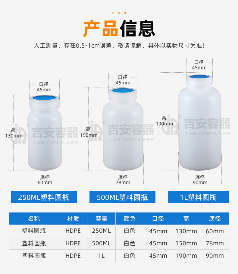 東莞市吉安包裝容器有限公司創(chuàng)立于2000年8月1日,是中國(guó)知名品牌企業(yè)。已通過(guò)ISO 9001質(zhì)量管理體系資質(zhì)認(rèn)證,加入了中國(guó)中空協(xié)會(huì),并獲得《中國(guó)知名品牌》,《國(guó)家標(biāo)準(zhǔn)合格產(chǎn)品》,《全國(guó)重合同守信用AAA級(jí)企業(yè)》,《質(zhì)量.服務(wù).誠(chéng)信AAA企業(yè)》等榮譽(yù)稱號(hào)。根據(jù)材質(zhì)的不同,我們的產(chǎn)品分為塑料容器、鐵質(zhì)容器、鋁材容器、玻璃容器、紙質(zhì)容器等五大類。按產(chǎn)品的名稱分為塑料桶、塑料瓶、包裝桶、涂料桶、機(jī)油桶、油脂桶、化工罐、膠水瓶、鐵桶、鐵罐、鋁瓶、鋁罐、阻隔瓶、高阻隔瓶等,容量從3ML至1000L多種規(guī)格,多種款式。適合包裝的產(chǎn)品包括:化學(xué)試劑、化工原料、化工助劑、飼料添加劑、油墨、油漆、樹脂農(nóng)藥、日用化學(xué)品、聚氨脂、膠粘劑,廣泛應(yīng)用于化工、建筑、食品、醫(yī)療、生物等各領(lǐng)域。