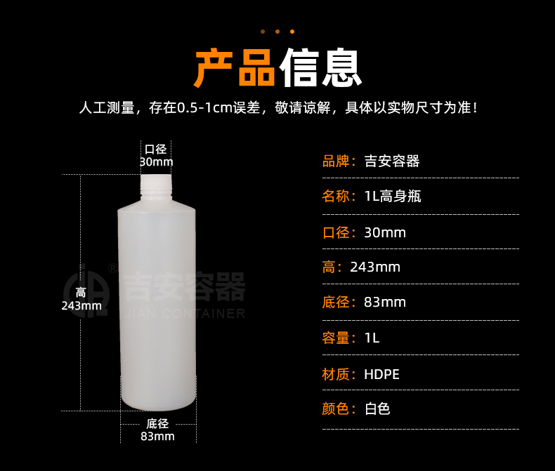小口塑料瓶采用全新HDPE塑膠原料吹塑而成,具備韌性好、耐酸堿、耐腐蝕、不變形,密封性能佳等特點,可根據(jù)客戶需求定制、改色、產(chǎn)品適用于化工、清洗劑、醫(yī)藥、液體、食品、農(nóng)業(yè)等各行業(yè)包裝。
