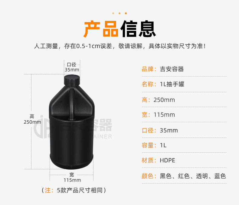 東莞市吉安包裝容器有限公司創(chuàng)立于2000年8月1日,是中國知名品牌企業(yè)。已通過ISO 9001質(zhì)量管理體系資質(zhì)認證,加入了中國中空協(xié)會,并獲得《中國知名品牌》,《國家標準合格產(chǎn)品》,《全國重合同守信用AAA級企業(yè)》,《質(zhì)量.服務.誠信AAA企業(yè)》等榮譽稱號。根據(jù)材質(zhì)的不同,我們的產(chǎn)品分為塑料容器、鐵質(zhì)容器、鋁材容器、玻璃容器、紙質(zhì)容器等五大類。按產(chǎn)品的名稱分為塑料桶、塑料瓶、包裝桶、涂料桶、機油桶、油脂桶、化工罐、膠水瓶、鐵桶、鐵罐、鋁瓶、鋁罐、阻隔瓶、高阻隔瓶等,容量從3ML至1000L多種規(guī)格,多種款式。適合包裝的產(chǎn)品包括:化學試劑、化工原料、化工助劑、飼料添加劑、油墨、油漆、樹脂農(nóng)藥、日用化學品、聚氨脂、膠粘劑,廣泛應用于化工、建筑、食品、醫(yī)療、生物等各領(lǐng)域。